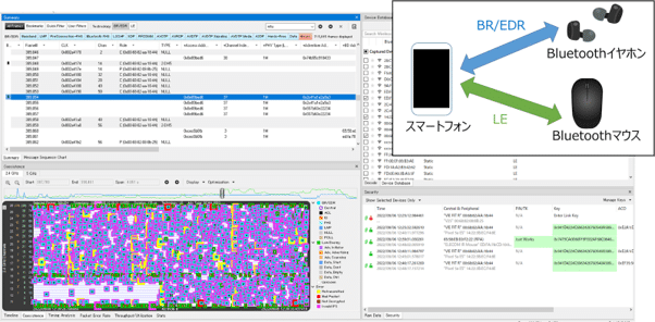 Teledyne社製のプロトコルアナライザ用ソフトウェア Wireless Protocol Suite(WPS)は複数の測定画面を備えており、さまざま視点からDual-Modeの解析を行うことができます。。それぞれの測定項目内のオススメポイントを紹介します。今回の例はスマートフォンにイヤホン(BR/EDR)とマウス(BLE)を以下の通りに接続したものになります。
