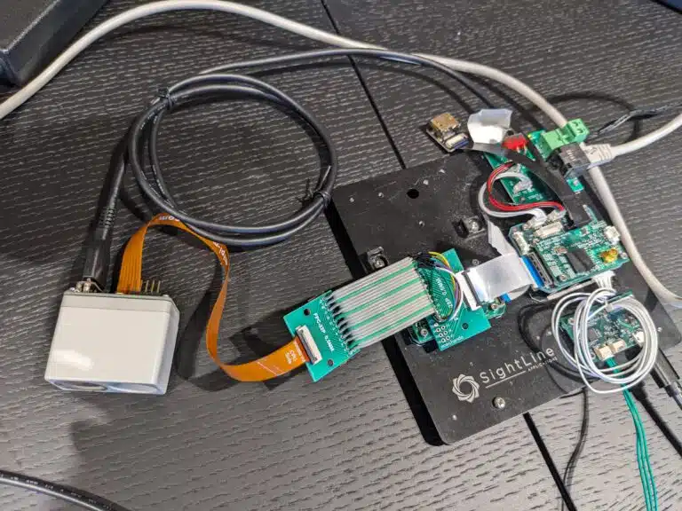では、早速、これらを接続してみます。ケーブルが様々つながっていますが、Hadron320からは、Boson320 USBがSLA-4000 USBポートに接続され、IMX412 MIPIが、ピン数変換ボードを介してSLA-4000 MIPIポートに接続されています。