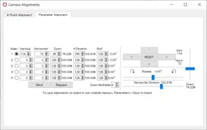 アラインメント設定ツールと組み合わせることで、合成位置を調整します。上下左右±128ピクセル、ズーム、水平方向伸長、ロール等をスライダー、あるいはマニュアル入力で調整することができます。