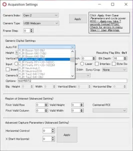 Boson320は、USB接続されています。USB接続のBosonを使用する場合、現在のVideoTrackソフトウエアでは、専用のAcquisition settingsが用意されていません。このため、Boson640 USBとして接続します。
