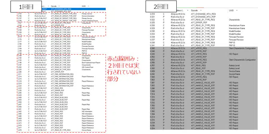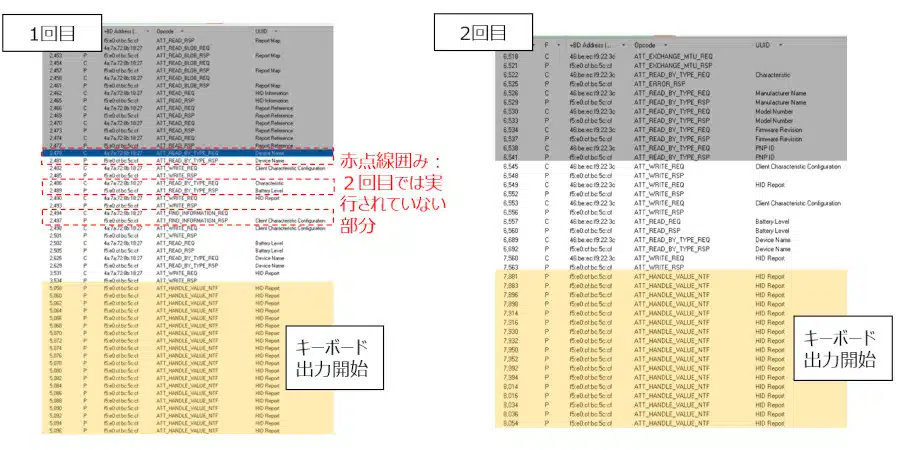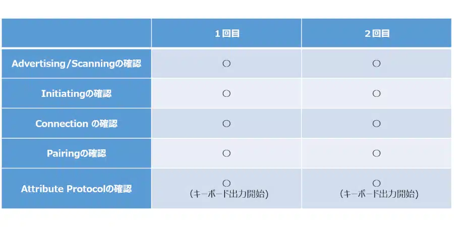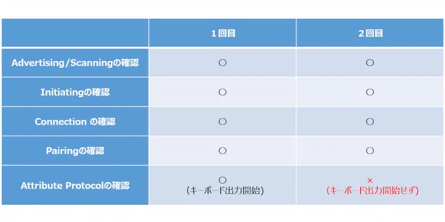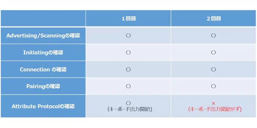 1回目/2回目ともPairingの確認までは各項目とも特に大きな問題はみられませんでしたが、2回目はキーボード出力も開始されませんでした。