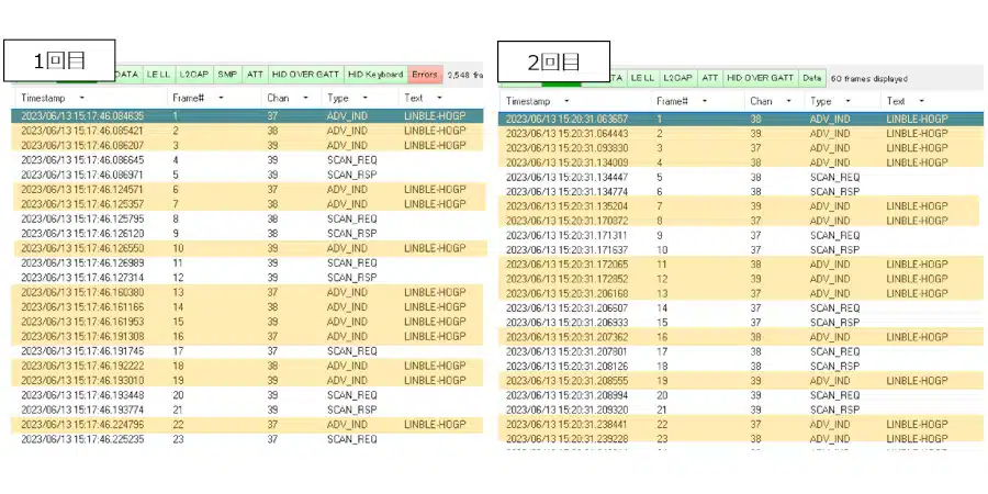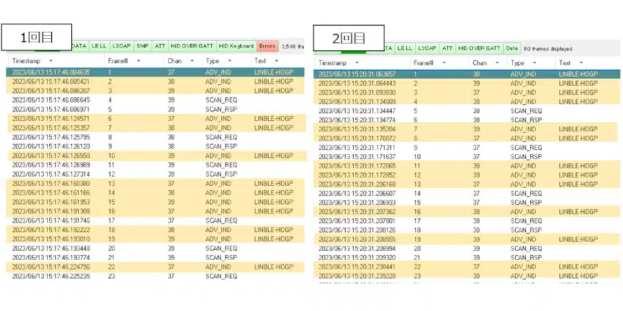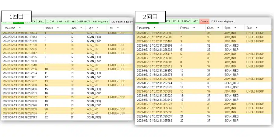 1回目/2回目共に、アドバタイズパケットの送信およびスキャンリクエストへの応答が問題なく行われていました。