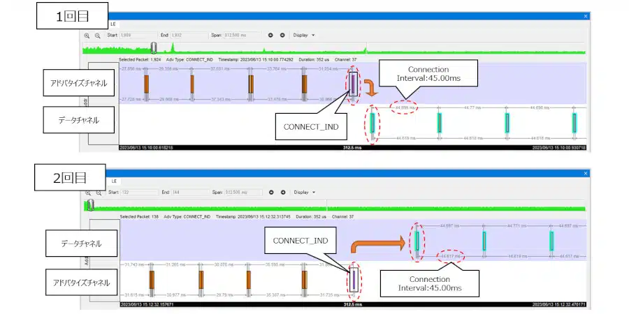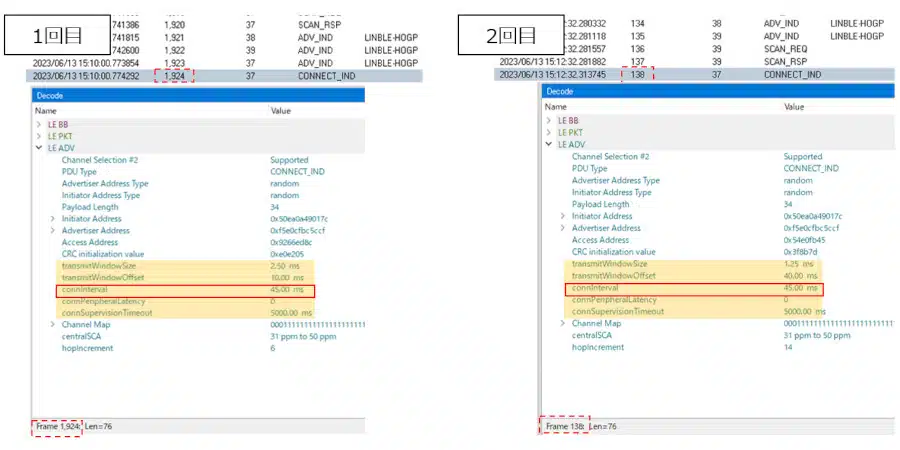 1回目/2回目共に、CONNECT_INDパケットの内容に大きな変化は見られませんでした(Connection Interval:45.00ms)。