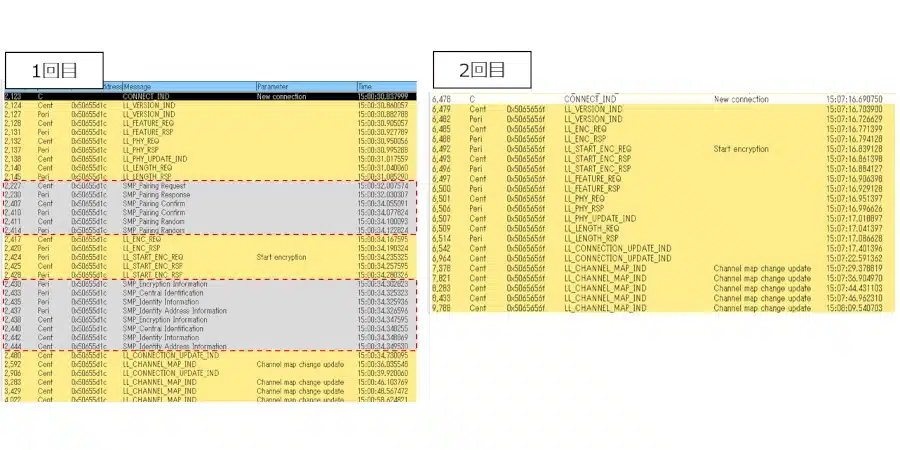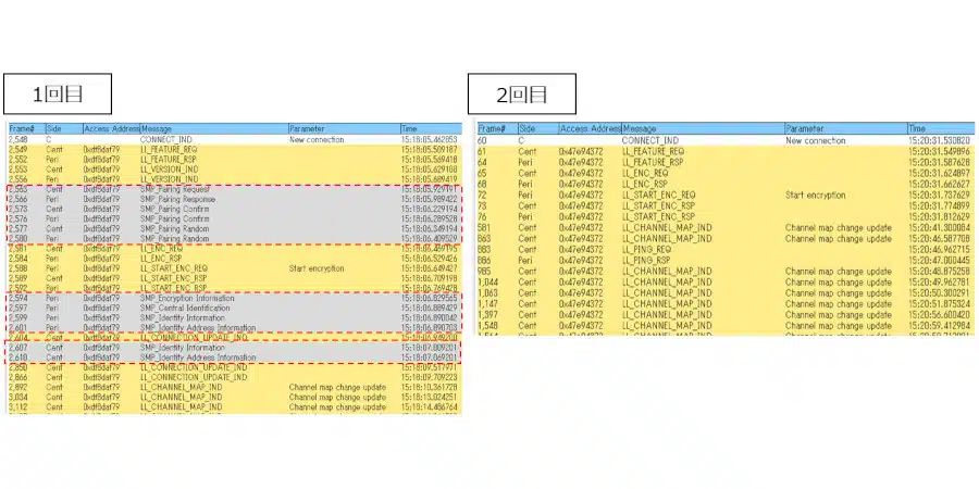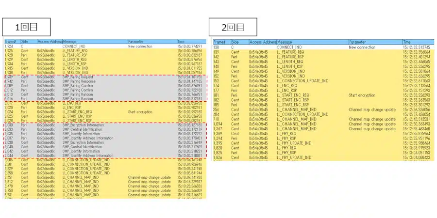 ボンディング(暗号化キーを保存)が行われるため、1回目でSMP(Security Manager Protocol)でペアリングプロセスが実行され、2回目はSMPの処理が行われていませんが、特に問題なく暗号化も行われていました。