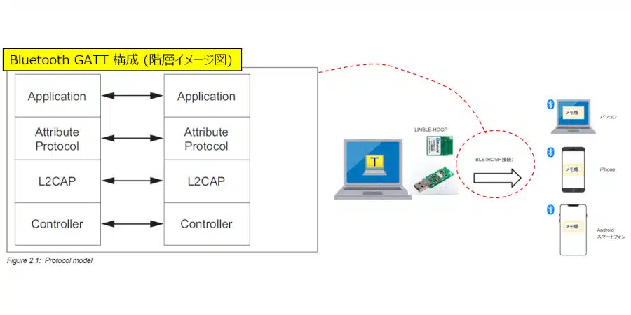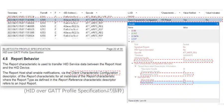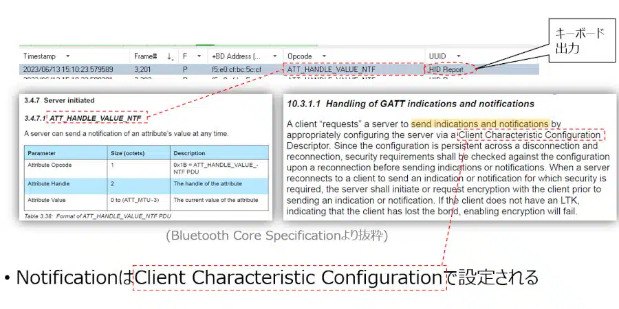 1回目/2回目ともPairingの確認までは各項目とも特に大きな問題はみられませんでしたが、2回目はキーボード出力も開始されませんでした。今回、Attribute Protocolのやり取りにて不具合が発生していることが分かったため、詳細を見ていきます。そもそもキーボード出力はAttribute ProtocolのNotificationで送信されます。