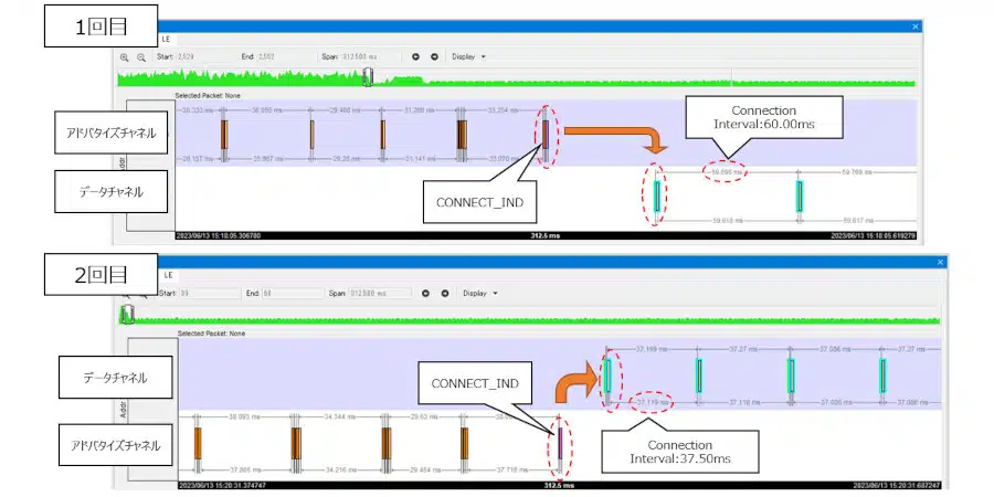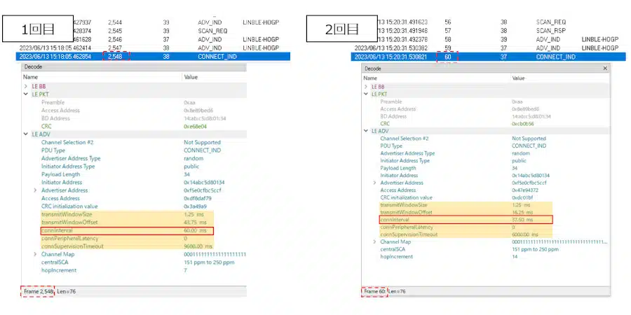 1回目/2回目で、CONNECT_INDパケットのConnection Intervalに変化がありました(1回目:60.00ms, 2回目:37.50ms)。