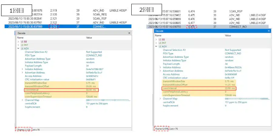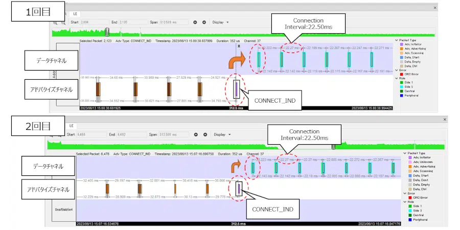 1回目/2回目共に、CONNECT_INDパケットの内容に大きな変化は見られませんでした (Connection Interval:22.50ms)。
