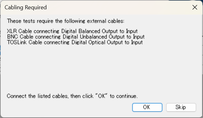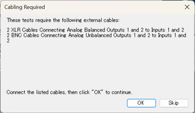 OK押下後、セルフテストが自動で開始される。ケーブルの変更が必要なときは、自動でプロンプトが表示される。