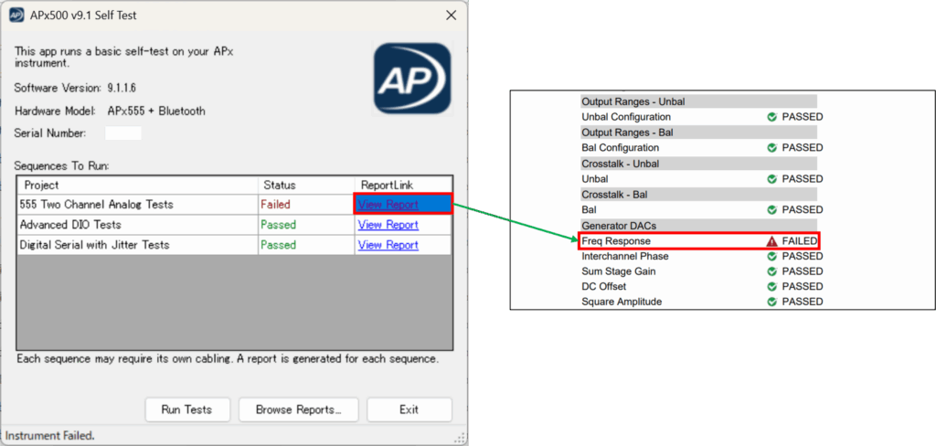 テスト完了後、セルフテストウィンドウ上に結果が表示。PASS/FAILいずれの場合でも試験結果はPDFに出力、保存される。View ReportでFAIL項目の詳細を確認可能。