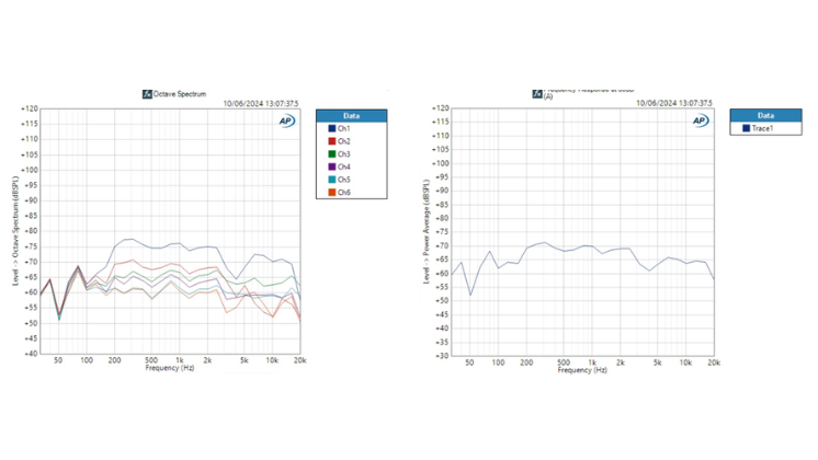6本(あるいはそれ以上)のマイクロホンから得られる周波数応答やクレストファクター(インパルス性歪みに関連)などの多角的なデータを、一度の測定で全てオーディオアナライザ内に取り込みます。