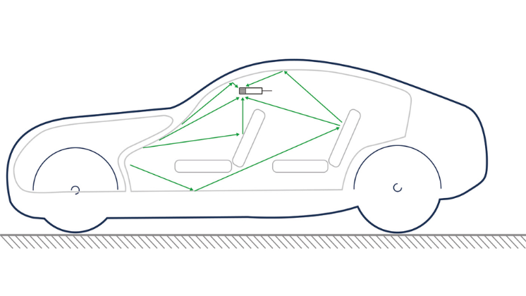 一般的なオーディオ評価が行われる自由音場(反射のない空間)や広い会議室とは異なり、車内は非常に狭く閉じられた空間です。音速に対して空間が狭いため、反射音が極めて短い時間で戻ってきてしまい、直接音と反射音の分離が困難です。