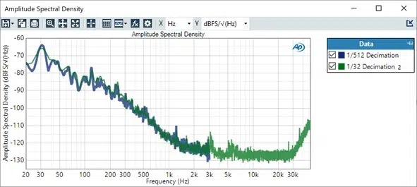 通常、使用するデシメーション(間引き)率は、DUTの仕様によって定義されます。ただし、前述のように、デシメーションレートは出力パスバンドを決定します。たとえば、テスト仕様で周波数応答を20 kHzに測定する場合、少なくとも20 kHzの帯域幅を提供するビットクロックとデシメーションレートを選択する必要があります。