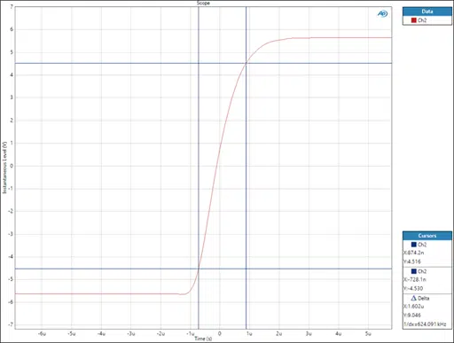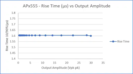 APxジェネレーターの矩形波の出力を200MHzの帯域幅で1.6 μs立ち上がり時間を測定した結果です。APx555の固有のスルーレートはジェネレーターからの信号の振幅に依存します。下図はその一例です。