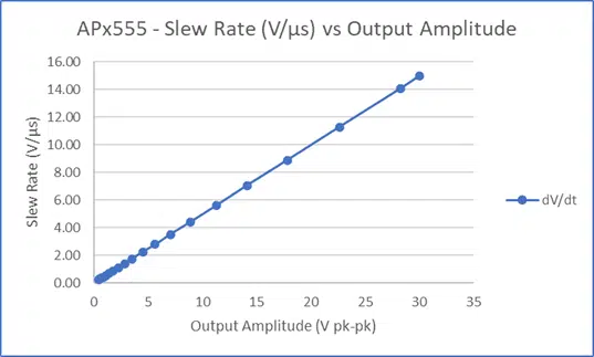 ゲインは、スルーレートに何倍も効果をもたらします。それは、全体の電圧スイングが増加し、それによってスルーレート方程式の分子(V/μs)が増加することで、スルーレートも増加することとなります。これはスルーレートと出力振幅尾グラフからも分かります。