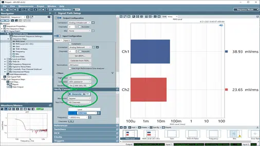 DIMとTIMは矩形波、サイン波ソースを組み合わせたアンプへの動的な刺激信号として組み合わせるテストとして、DUTを介した2つのソース信号間の相互変調歪みのテストを可能としています。APx555にはこれらの機能が搭載しています。このテストの基本的な概念は、非常に高いかと信号(矩形波)とサイン波を組み合わせて、オーディオコンテンツの非常に動的なスペクトルを表す信号を生成できます。DIMはIEC 60268-3, sec. 14.12.9で規定されています。