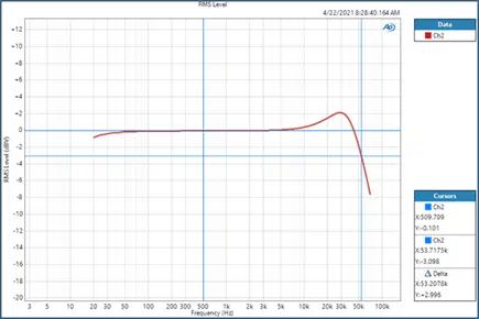 例えば、下図にありますパワーアンプは立ち上がり時間は約5.84 μs.です。先程の変換式を使うと、約60kHzの帯域幅に見えます。実際には53.2kHzの帯域幅がこのユニットのサインスイープ測定になります。