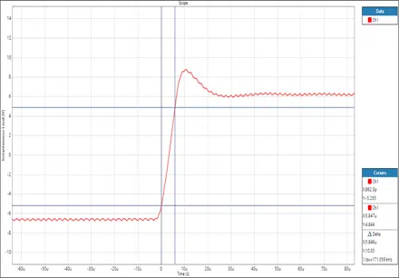 dV/dtはアナライザーのスコープモニターにカーソルを置く事で、測定できます。pk-pkポイントの10-90%までの範囲でカーソルを設定できます。下図はした立ち上がり時間の結果です。