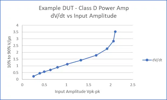 入力レベルは約1.7 Vpk-pkの割合で線形性のスルーレートになっていることが分かります。それ以上は飽和しています。このDUTは1.7 Vpk-pkスルーレートで評価し、大きな信号スイングを得る最適の場所となります。スルーレートは1.675 V/µsと測定できました。