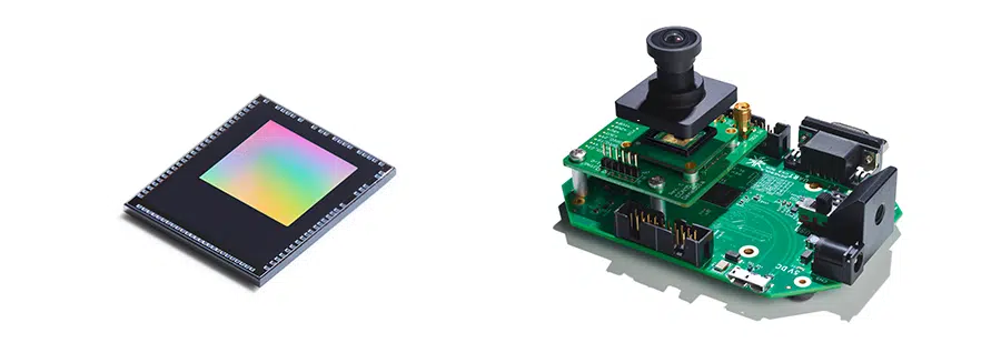 【Prophesee GENX320イベントベースビジョンセンサー IC チップ(左)・評価キット(右)】