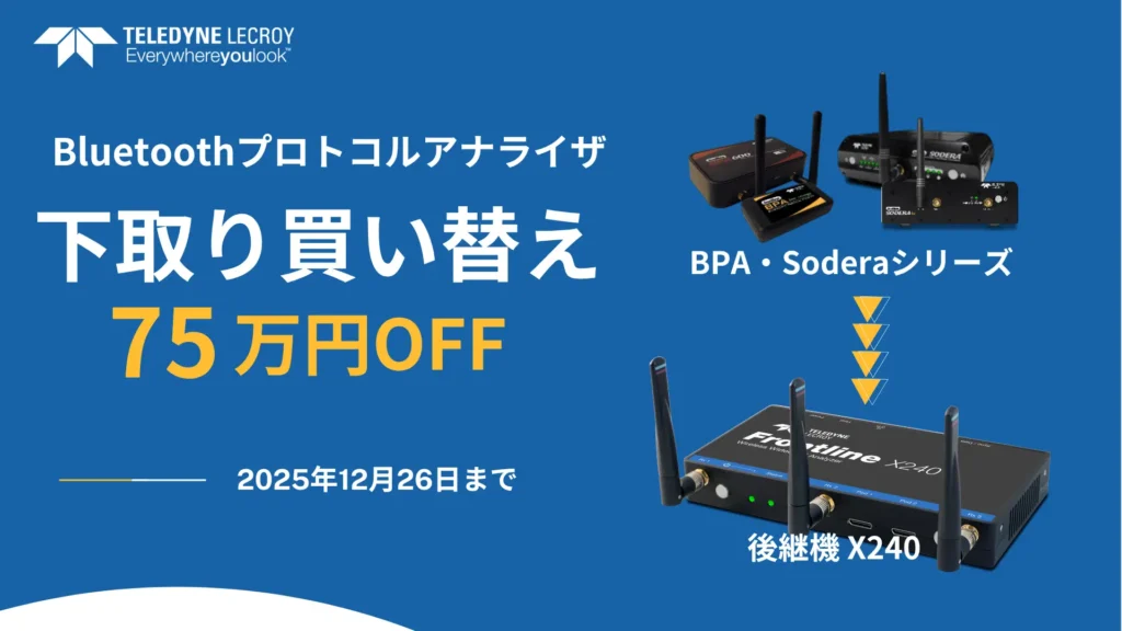 Teledyne LeCroy社製 旧モデルのプロトコルアナライザ限定で、現在下取り・買い替えキャンペーンを実施しております。人気のコンパクトモデルX240を特別価格でご提供しておりますので、ぜひこの機会をご活用いただき、Bluetooth製品の開発にお役立てください。