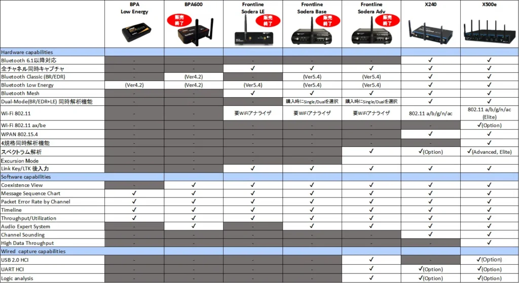 今回下取り対象となっている旧シリーズでも簡易的な測定にはご使用いただけますが、BPAシリーズはBluetooth ver4.2、SoderaシリーズはBluetooth ver5.4までの対応となります。また、ご使用いただける旧ソフトウェアComProbe Protocol Analysis System(CPAS)の、最新ソフトウェアバージョンは15.17であり、今後アップデート予定はございません。