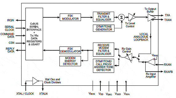 フレキシブルなラインドライバや受信回路、ハイブリッド回路はチップに集積されておりますので、2または4線ラインインターフェイスを構築するパッシブ部品だけを必要とします。音声による誤作動に優れた高品質のDTMFデコーダと標準のDTMFエンコーダを内蔵しており、また代わりに、これらのブロックはユーザ設定/プログラムされたシングルトーンもしくはデュアルトーン信号、単純なメロディー、コールプログレス信号或いはモデム呼び出しと応答トーンの送信と検出に使用することも可能です。