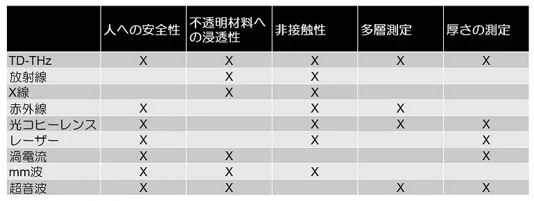 テラヘルツ技術センサと代替えセンサ(既存技術)との比較