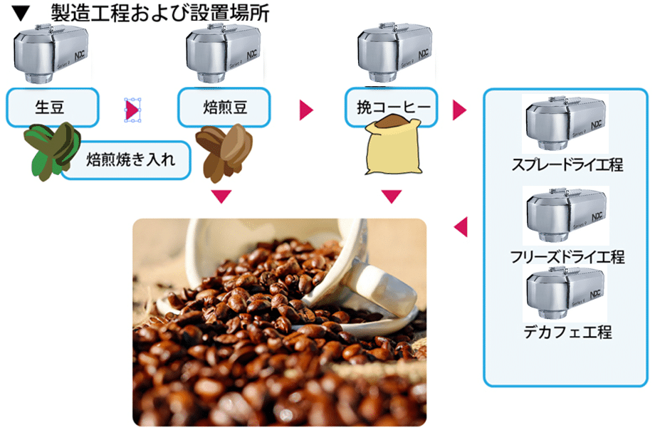 コーヒーのおいしさの決め手である香りは、水分含有量によって大きく変化すると言われています。Series9を使用し、製造工程の様々な段階をリアルタイムに水分量の測定・管理を行うことで、香りの良い上質なコーヒーを安定して製造することが可能になります。