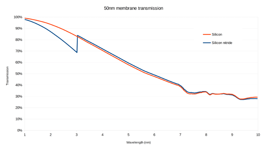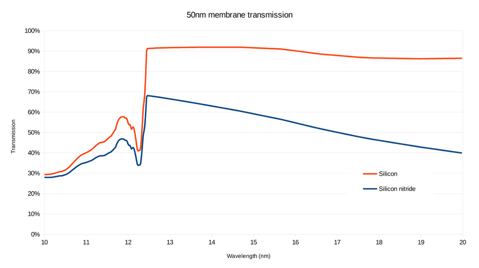以下はLBL CXRO X線データベースのデータを基に、Silson社が作成したSiN薄膜とSi薄膜における軟X線透過率の比較グラフです。